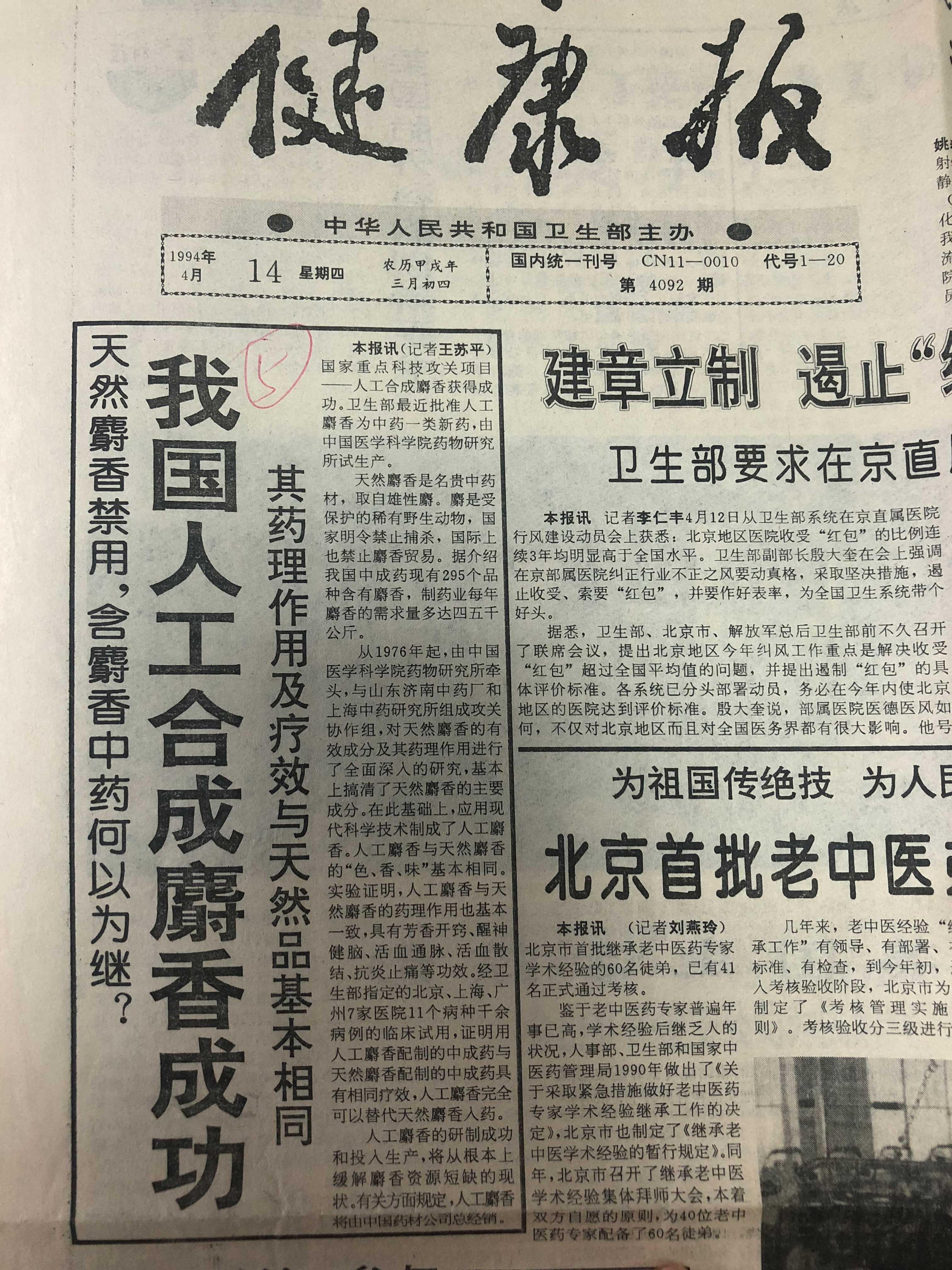 健康报报道——我国人工合成麝香成功